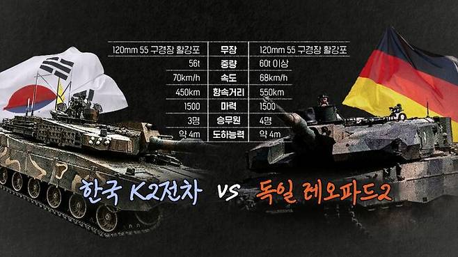 이 K2 전차가 2022년 1월부터 2월까지 노르웨이에서 동계 시험평가를 받았거든요. 노르웨이군에서 차기 전차를 구입하겠다는 사업을 내놓으니까 경쟁하겠다고 온 여러 가지 전차가 있었죠. 그중에서 최종 후보로 올랐던 게 우리 K2 흑표 하고 독일 레오파드, 세계적인 전차예요. 또 독일 하면은 전차의 나라잖아요. 2차 대전 때 전차로 쓸어버렸으니까요. 이 두 개가 노르웨이에서 2022년 1, 2월에 같이 동계 평가를 받아요. 평가는 두 가지예요.