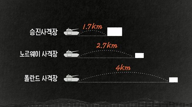 우리 K2 전차 여기서만 쏴봤지 2.7km 표적을 쏴본 적이 없어요. 그리고 이때 표적이 어떻게 됐느냐, 4분의 1 크기로 줄여놨어요. 그리고 승진사격장의 표적은 고정 표적이에요. 가만히 있어요. 그런데 노르웨이는 위치를 딱 보여주고 그다음 눕혀버렸어요. 그다음에 그 사격 사선에 들어가면 저쪽 조종하는 사람, 운용자가 그걸 마음대로 세우는 거예요. 그러면 K2 전차는 기다렸다가 오는 것을 보고 딱 쏘는 거죠.