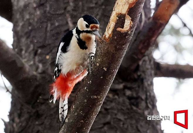 오색딱따구리가 나무를 쪼는 모습은 겉보기에는 나무에 상처를 주는 것처럼 보인다. 하지만 오색딱따구리는 날카로운 부리로 나무를 쪼아 해충을 찾아 제거함으로써, 결과적으로 나무를 병충해로부터 보호하는 역할을 한다. 이 둘은 윈-윈 관계를 형성하는 공생관계다. 사진=김현민 기자 kimhyun81@