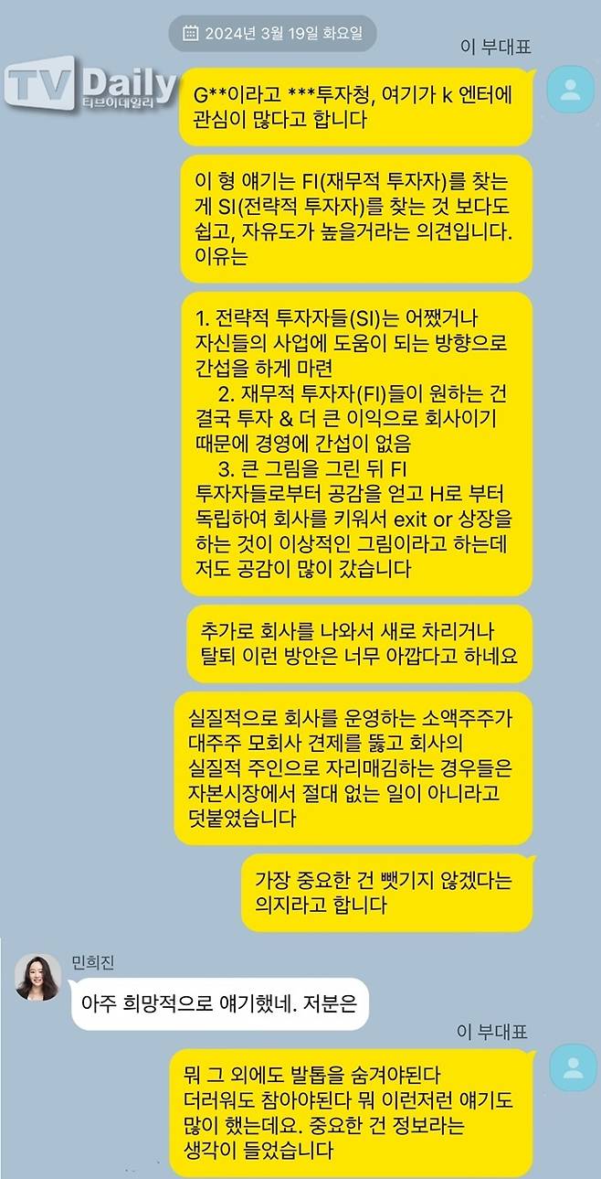 티브이데일리는 어도어 민희진 대표와 이 모 부대표, 어도어 핵심 경영진들이 나눈 문자 내역을 입수했다. 하이브와 어도어의 경영권 갈등을 중심으로 민 대표와 이 부 대표가 실제로 주고 받은 문자를 그대로 재구성했다.