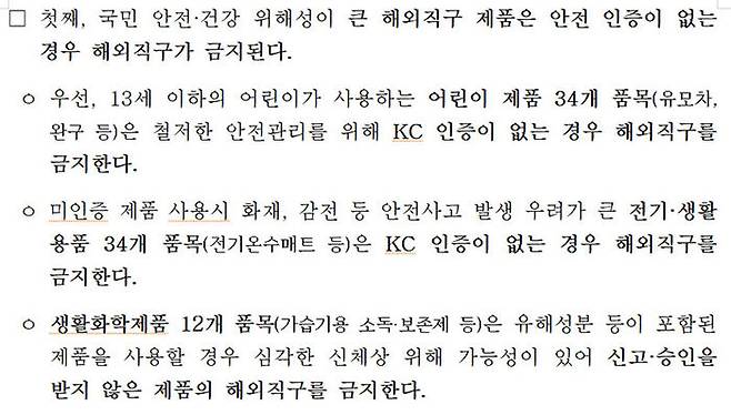 일단 보도자료를 살펴보면요. 보도자료는 먼저, 2페이지에서 [첫째, 국민 안전·건강 위해성이 큰 해외직구 제품은 안전 인증(KC인증)이 없는 경우 해외직구가 금지된다.]고 단정적으로 씁니다. 그러면서 어린이 제품과 전기용품, 생활화학제품 등이 이에 해당하는 제품이라고 설명한 뒤,