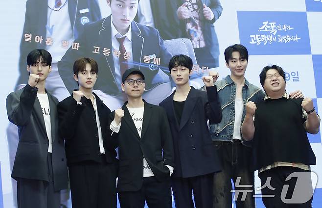(서울=뉴스1) 권현진 기자 = 배우 주윤찬(왼쪽부터)과 봉재현, 이성택 감독, 윤찬영, 원태민, 고동옥이 27일 서울 마포구 스탠포드호텔에서 열린 웨이브·왓챠 새 오리지널 시리즈 '조폭인 내가 고등학생이 되었습니다'(극본 정다희/이하 '조폭고') 제작발표회에서 포즈를 취하고 있다.