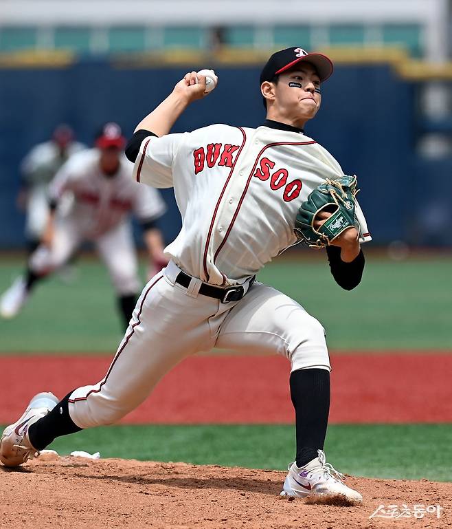 27일 서울 목동야구장에서 ‘제 78회 황금사자기 전국고교야구대회 겸 주말리그 왕중왕전(동아일보사·스포츠동아·대한야구소프트볼협회 공동주최)’ 덕수고와 서울컨벤션고의 4강 경기가 열렸다. 덕수고 선발투수 유희동이 힘차게 볼을 던지고 있다.