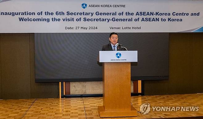(서울=연합뉴스) 27일 서울 중구 롯데호텔에서 한-아세안센터 제6대 사무총장 취임식 겸 아세안 사무총장 방한 환영행사에서 까으 끔 후은 아세안 사무총장이 축사를 하고 있다. 2024.5.27 [한-아세안센터 제공. 재판매 및 DB 금지]