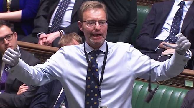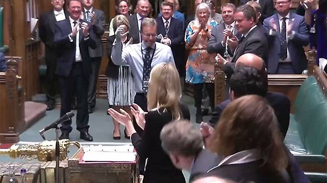 영국 의사당에 셔츠 차림의 한 남성이 들어서자, 의원들이 환호하며 기립박수로 그를 맞이합니다.