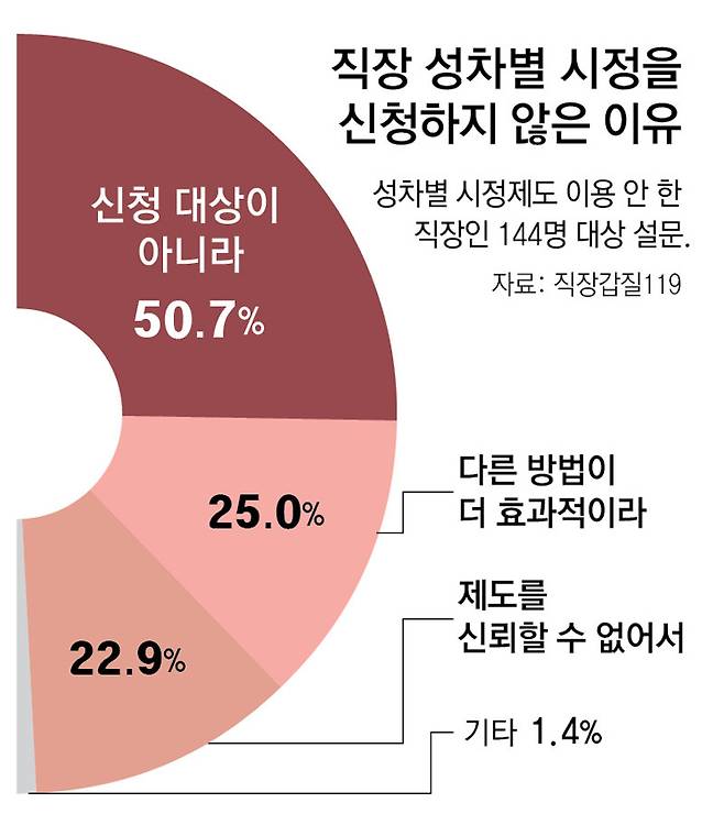 직장갑질119가 여론조사 전문기관인 글로벌리서치에 의뢰해 2월 직장인 1000명을 대상으로 설문한 결과 성차별을 경험한 응답자(484명)의 59.5%는 노동위 시정제도를 모른다고 했다. 또 성차별 경험자 가운데 144명은 노동위 시정제도를 이용하지 않았다고 답했다. 특히 이들 중 22.9%는 ‘시정제도를 신뢰할 수 없어서 이용하지 않았다’고 했다. 자신의 사례가 ‘시정 신청 대상에 해당하지 않아서’ 제도를 이용하지 못했다는 응답도 50.7%에 이르렀다.