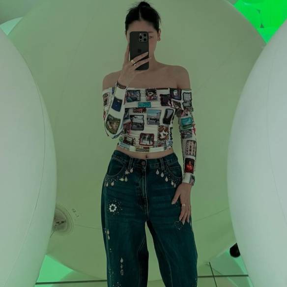 제니의 사복 패션에 자주 등장하는 아이템 중 하나는 루스한 실루엣의 데님 팬츠일 것 같은데요. 특히 골반에 걸쳐 입는 연출을 통해 슬림한 허리 라인을 강조해 주는 걸 알 수 있어요. 그뿐만 아니라 사진처럼 우아한 무드의 상의와 믹스하여 의외의 매력을 드러내곤 합니다.