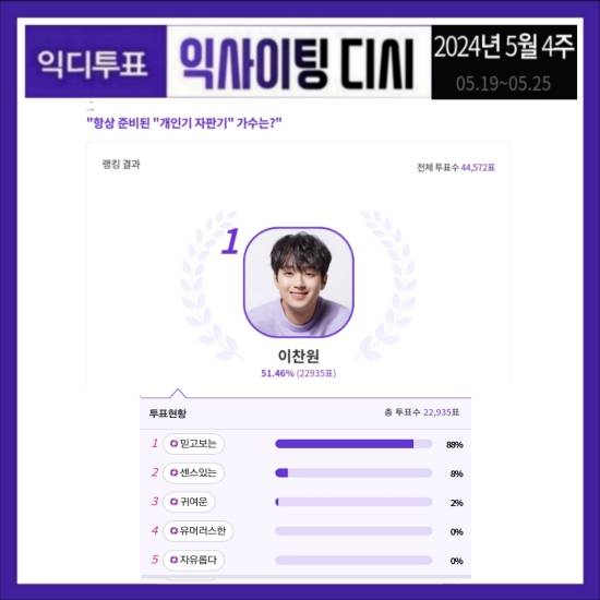 이번 투표에는 총 44,572표가 모였으며, 이찬원은 22,935표(51.46%)를 얻어 정상에 올랐다. 매력 키워드 1위는 '믿고 보는'으로, 비율은 88%였다. 그리고 '센스 있는' 8%, '귀여운' 2% 등이 뒤를 이었다.