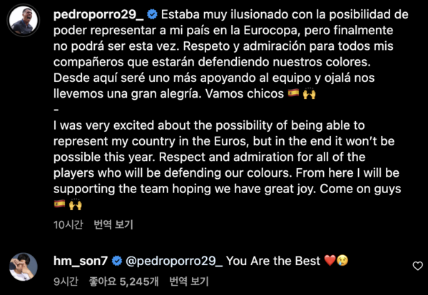 손흥민이 유로 2024 명단 제외 아픔을 겪은 페드로 포로를 위로했다.