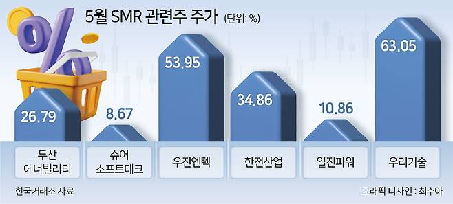 28일 한국거래소에 따르면 혁신형 소형모듈형원전(i-SMR) 기술개발사업에 참여하는 우리기술 주가는 이달 63.05% 올랐다. 미국 최대 SMR 설계업체인 뉴스케일파워가 짓는 370억 달러(약 50조원) 규모의 SMR 건설 프로젝트에 원자로 등을 납품하기로 한 두산에너빌리티는 26.79% 상승했다. 이외 우진엔텍(53.95%), 한전산업(34.86%), 일진파워(10.86%), 슈어소프테크(8.67%) 등 SMR 관련주가 강세를 보였다.