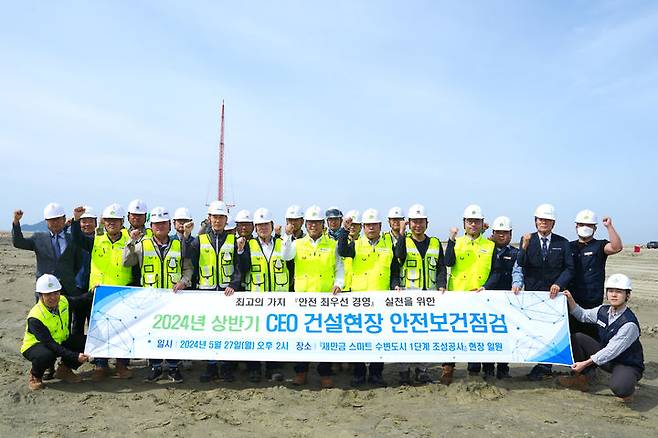 새만금개발공사가 새만금 스마트 수변도시 조성공사 현장에서 '안전 최우선 경영' 실천의 하나로 기관장 주관 노·사 합동 안전보건점검을 했다고 밝혔다.