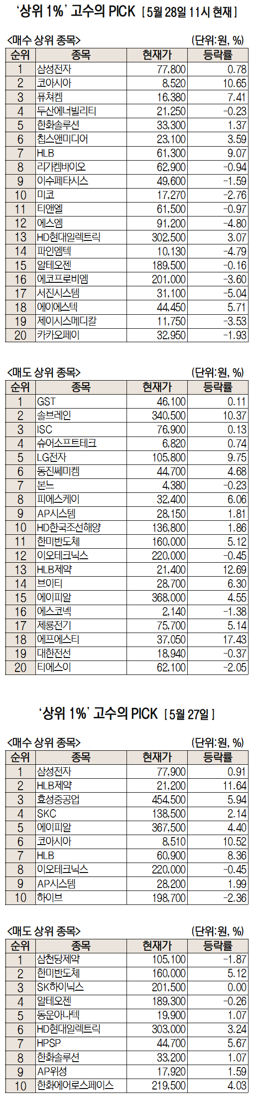 미래에셋증권은 자사 고객 중에서 지난 1개월간 수익률 상위 1% 투자자들의 매매 종목을 집계해 실시간·전일·최근 5일 기준으로 모바일트레이딩시스템(MTS)상에서 공개하고 있다. 이 통계 데이터는 미래에셋증권의 의견과 무관한 단순 정보 안내이며 각각의 투자자 개인에게 맞는 투자 또는 수익 달성을 보장하지 않는다. 또 테마주 관련종목은 이상 급등락 가능성이 있으므로 유의해야 한다.