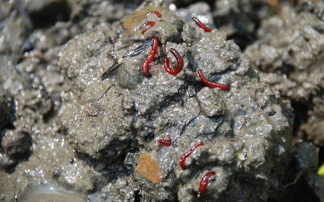 | ▲ 2017년 여름, 세종보 상류 마리나 선착장에서 채취한 펄 속에 깔따구가 살아있었다. |