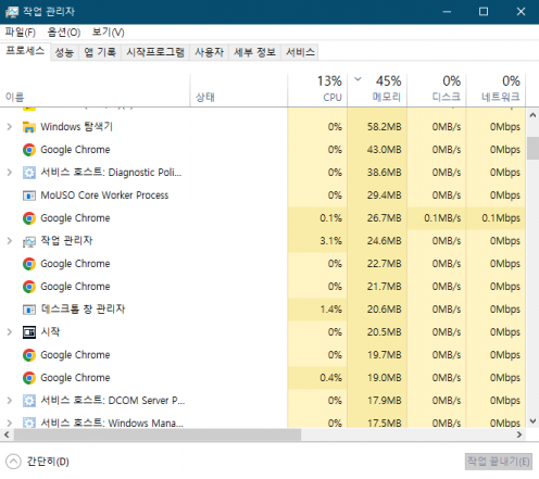 윈도우에서 키보드 ‘Ctrl+Shift+ESC’ 단축키를 입력하면 ‘작업 관리자’가 실행됩니다. 이곳에서 어떤 프로그램이 실행 중인지, 얼마나 많은 자원을 쓰고 있는지 확인할 수 있어요. 성능 탭을 누르면 CPU, GPU 가동률까지 볼 수 있죠. 프로세스 탭에서 필요 없는 프로그램을 선택한 다음, 하단에 위치한 ‘작업 끝내기’ 버튼으로 누르면 종료됩니다.