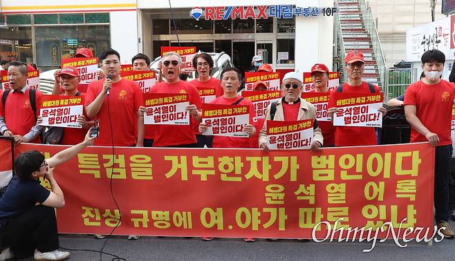 해병대 전우들이 '채상병 특검법' 부결 직후 국민의힘 당사 앞을 찾아 "윤석열 정권을 참수하는 데 역할을 하겠다"며 분노했다.