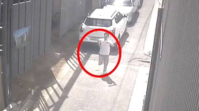 흰색 옷을 입은 남성이 전속력으로 골목을 뛰어갑니다.