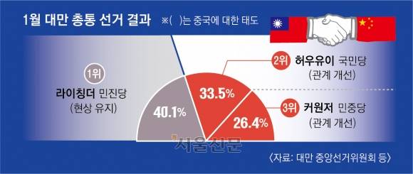 이제 그는 향후 국정 운영에서 차이 전 총통보다 훨씬 어려운 ‘고차 방정식’을 풀어야 한다. 그가 맞서야 하는 중국은 갈수록 힘이 세지는데 그의 지지층은 전임자 때보다 크게 얇아졌기 때문이다.