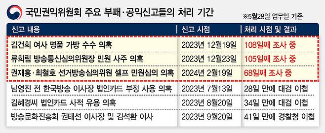 국민권익위원회에 접수된 주요 부패·공익 신고들의 처리 기간은 신고 대상이 여권인지 야권인지에 따라 확연히 차이 난다. 28일 업무일을 기준으로 현재 김건희 여사(108일)와 류희림 방송통신심의위원장(105일), 여권에서 추천한 선거방송심의위원(68일) 등 여권 인사를 대상으로 한 심의는 법정 시한(90일)을 넘기거나 예외적으로 신고 처리가 연장됐지만, 이재명 더불어민주당 대표의 부인 김혜경씨(34일)를 비롯해 전임 정부에서 임명된 권태선 방송문화진흥회 이사장(41일)과 남영진 전 한국방송(KBS) 이사장(28일) 등 야권 인사를 겨냥한 심의는 연장 한번 없이 신속하게 처리돼 수사 의뢰됐다. 정치권에서 “국민권익위가 아닌 대통령권익위냐”(더불어민주당)는 반발이 터져 나오는 이유다.