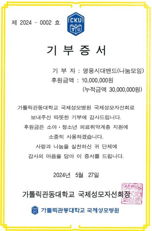 영웅시대밴드 나눔모임은 지난해 국제성모병원에 2000 만원을 기부한 바 있다.기부금은 재활치료를 받는 장애아동의 의료지원비용으로 사용됐다. 이로써 누적 후원금은 3000 만원으로 늘어났다.