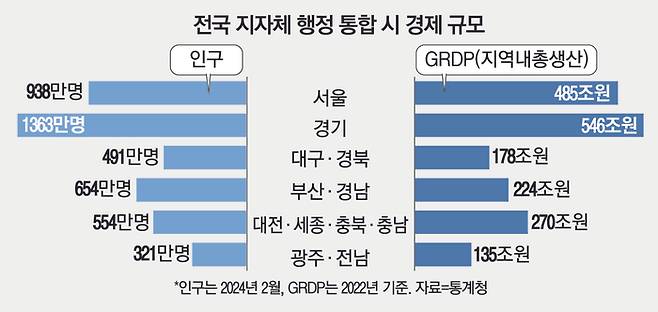 통합에 나선 지자체들은 규모의 경제를 갖추고 중앙정부 권한을 대폭 이양 받아 자치권을 강화하면 수도권 집중 현상도 막을 수 있다고 보고 있다. 행정 통합 시 GRDP(지역내총생산)는 충청권이 270조, 부산 경남은 224조, 대구경북은 178조, 광주전남은 135조의 규모를 갖게 된다. 서울(485조), 경기(546조)에는 여전히 크게 못 미치지만 지방 재정 확대를 통해 도시계획과 교통, 산업, 복지, 교육 등 각 분야에 걸쳐 수도권에 맞서 경쟁력을 키울 수 있다는 판단이다. 이철우 경북지사도 “국방 외교 이외의 모든 권한을 이양받아 미국 주 정부처럼 운영해야 지방소멸과 저출생 문제 등 국가난제를 해결할 수 있다”고 주장했다.