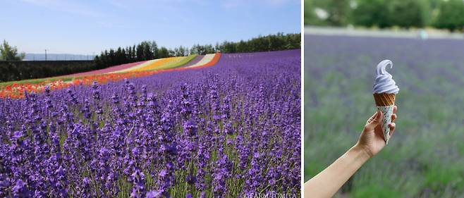 홋카이도의 푸른 하늘 아래 펼쳐진 보랏빛 물결, 바로 '팜 도미타 라벤더 밭'이다. 넓은 들판을 가득 메운 라벤더가 바람에 살랑이며 라벤더 향기가 주변에 가득한 이 순간은 시간이 멈춘 듯 아름답다. 후라노의 보랏빛 라벤더는 7월 중순에 절정을 맞지만, 농장은 라벤더 외에도 다양한 꽃밭으로 구성되어 있어 1년 내내 아름다운 풍경을 선사한다. 꽃들이 만발한 정원을 산책하며 홋카이도 여행의 하이라이트를 만끽해보자. 이렇게 예쁜 보랏빛 음식이 또 있을까 싶은 '라벤더 소프트크림'도 꼭 먹어보길 추천한다.