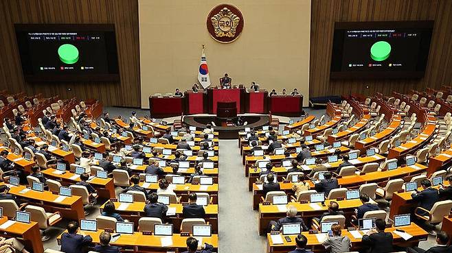 ▲ 28일 오후 국회 본회의에서 4·16세월호참사피해구제 및 지원 등을 위한 특별법 일부개정법률안이 통과되고 있다.