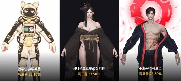 무도가(남)은 도복, 수인, 테크 웨어 등 다양한 콘셉트 아바타가 출전했는데 주효 유저의 매화가 쟁쟁한 경쟁작을 누르고 대상에 올랐다. 2위인 칠흑 산군과는 4% 정도 차이가 난다.