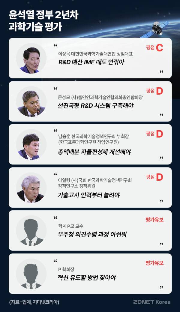 지디넷이 24년 창간을 맞아 실시한 윤석열 정부 2년차 과학기술 분야 정책 평가에도 이런 분위기가 그대로 반영됐다. 평가에 참여한 위원들은 "IMF 때도 R&D 예산은 깎지 않았다"면서 과학기술 정책에 대해 D학점을 부여했다.