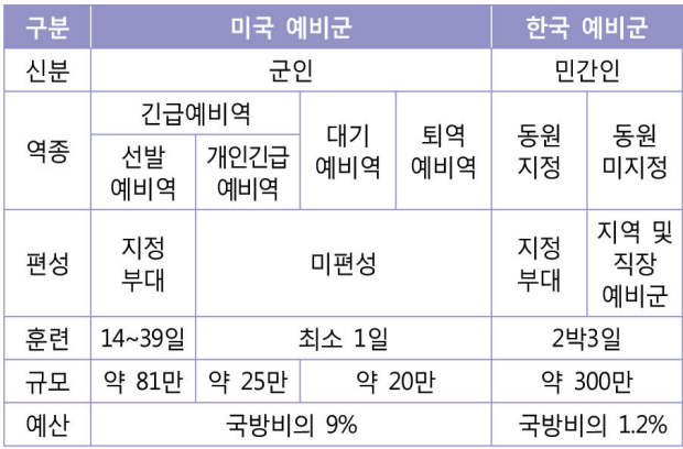 국방연구원에 따르면, 미국의 예비군 전력은 선발예비역 81만명을 포함해 약 120만명에 이르고, 예비군 전력 유지를 위해 쓰는 돈이 전체 국방비의 9%에 이른다. 한국군은 예비군이 300만명에 이르지만 실제 훈련은 연 3일, 예산은 국방비의 1.2%에 불과하다.