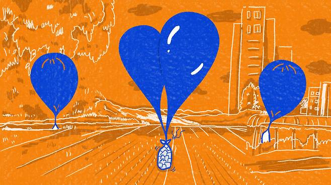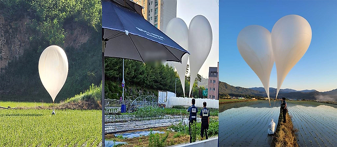 풍선의 크기는 3미터에서 4미터 가량으로, 밑에 비닐봉지가 매달려 있습니다. 비닐봉지 안에는 오물과 각종 쓰레기가 들어있는 것으로 확인됐습니다. 또 풍선과 비닐봉지를 연결하는 끈에는 일정 시간이 지나면 터지도록 타이머와 기폭장치가 달려 있었습니다.
