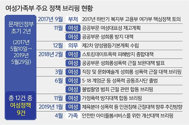 전 정부와 비교하면 방향성은 더욱 뚜렷이 대비된다. 2017년 5월10일 문재인정부 출범 이후 첫 2년간 여가부 주최 브리핑은 12건이다. 법적으로 의무화된 1건과 부처 차원의 1건을 제외한 10건 중 9건이 성폭력·가정폭력·데이트폭력 등 여성 정책 관련이었다.