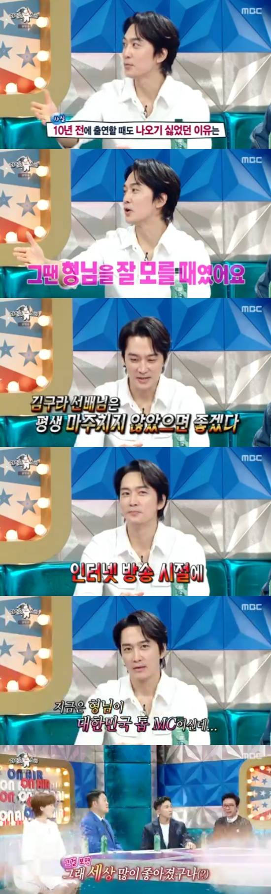 또 송승헌은 "그리고 예전에 구라 형님 인터넷 방송 시절에..."라고 하더니 "지금은 대한민국 최고의 MC 중 한 분 아니시냐. '세상 많이 좋아졌구나' 싶다"고 은근슬쩍 돌직구를 날려 웃음을 자아냈다.