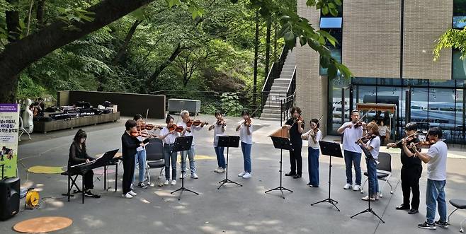 부산 북구 평생학습관 바이올린 프로그램 수강생들이 최근 만덕도서관 나무 그늘에서 클래식과 트로트 음악 등을 바이올린으로 연주하고 있다. 북구 관계자는 “‘봄날의 하모니, 바이올린 작은 음악회’라는 이름으로 열린 연주회를 통해 수강생은 연습한 곡을 공연할 기회를 얻었고, 구민들은 이들의 연주를 감상하며 봄날의 여유를 즐길 수 있었다”고 말했다.