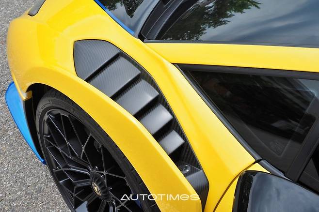 휠 하우스 위에도 별도의 공기 통로가 있다. 바퀴가 빠르게 회전할 때 발생하는 와류를 최소화하고 바람을 올바르게 펴서 내보내는 역할을 한다. 거대한 센터락 휠과 넓은 접지 면적을 가진 타이어, 카본세라믹 브레이크 조합도 훌륭하다. 사이드 스커트는 매우 날카롭고 C필러에도 별도의 에어 덕트가 뚫려 있어 뒤쪽 엔진 열을 식힌다.