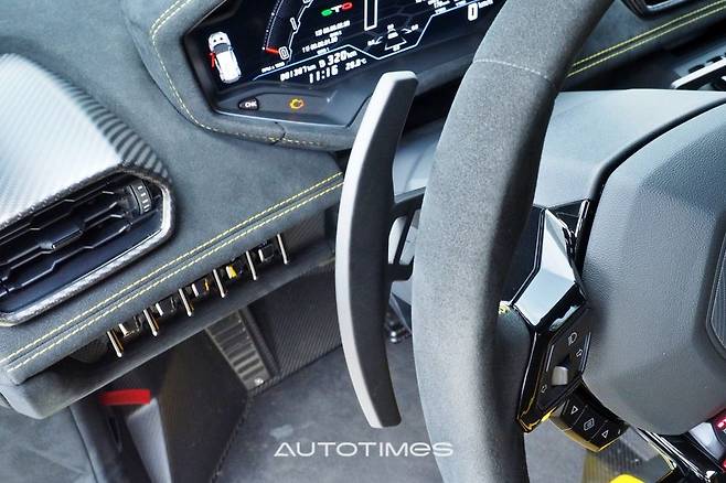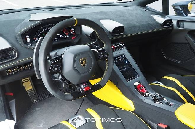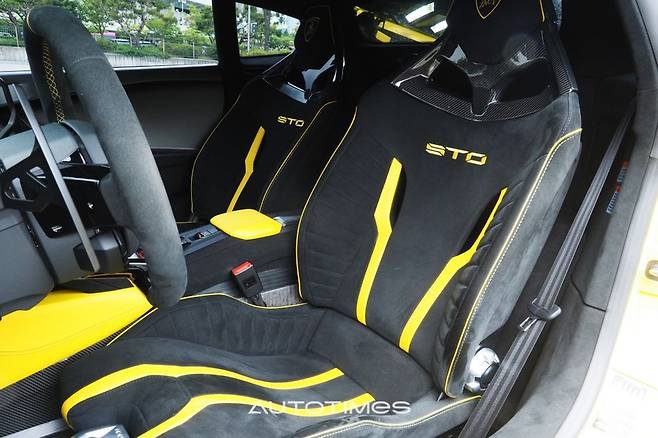 실내는 기존 우라칸과 큰 차이가 없다. 넓은 대시보드와 화려한 풀 디지털 계기판, 세로형 센터페시아 모니터, 각종 토글 버튼도 마찬가지다. 반면 도어 패널을 비롯한 곳곳에는 무게를 줄이기 위한 흔적을 찾아볼 수 있다. 탄소섬유의 양을 늘렸고 알칸타라 조합으로 역동적인 성격을 극대화했다. 실제 우라칸 STO는 퍼포만테보다 20% 더 가벼운 앞 유리를 달았고 전체 75% 부분을 탄소섬유로 꾸몄다. 그 결과 1,339㎏까지 무게를 낮출 수 있었고 이는 퍼포만테보다도 43㎏ 더 가벼운 수치다.