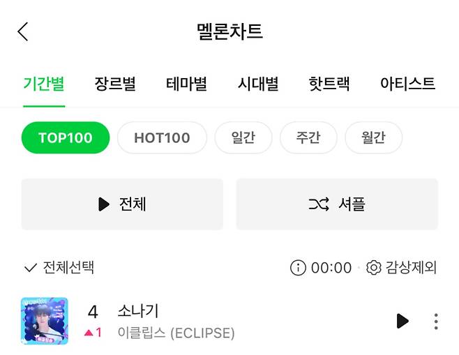 30일 00시 국내 음원 주요 사이트 멜론에서 이클립스의 '소나기'가 TOP 100 차트 4위를 기록했다. '소나기'는 '선재 업고 튀어 OST Part 1' 앨범의 수록된 곡으로 발라드 장르의 서정적인 곡이다.