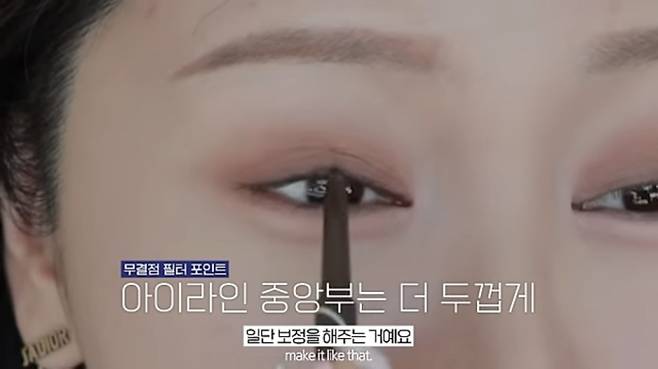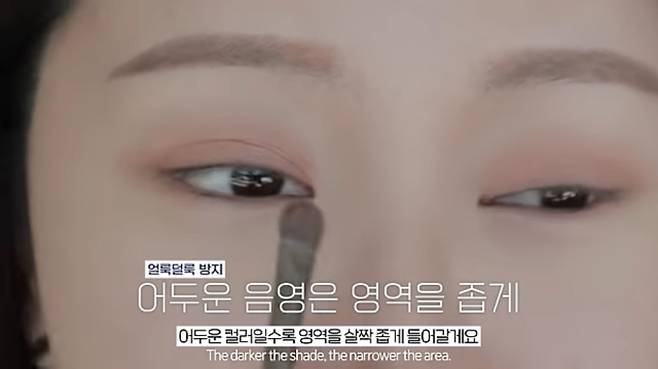 펜슬 라이너로 아이라인 중앙부는 더 두껍게 그려 눈 크기를 커 보이게 칠해준 뒤, 부드러운 아이라인 표현을 위해 진한 다크브라운 컬러 섀도를 브러시에 묻혀 라인을 이어 그려준다. 브러시에 남은 양으로 눈앞머리도 터 줘 시원해 보이는 눈매를 만들어 주고 눈꼬리 라인은 날렵하게 풀어 그려 준다.