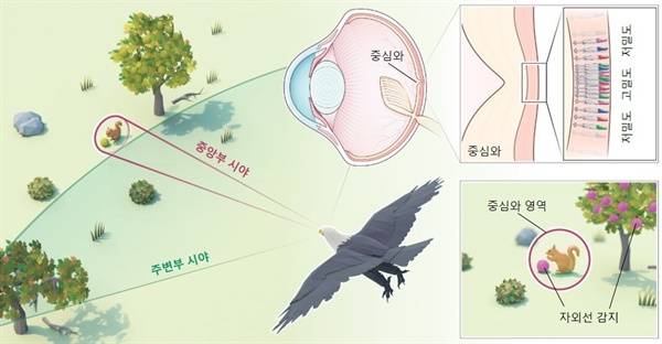 기초과학연구원은 "동물의 눈은 서식지와 생존환경에 맞게 최적화돼 있는데, 독수리와 같은 조류의 눈은 높은 나무 위에서 서식하는 생존환경에 맞춰 망막에 깊고 좁은 모양의 '중심와(Fovea)'가 존재하도록 진화했다"면서 "깊고 좁은 중심와는 멀리 있는 물체를 확대해 보기 유리하게 만든다"고 개발 배경을 소개했다.
