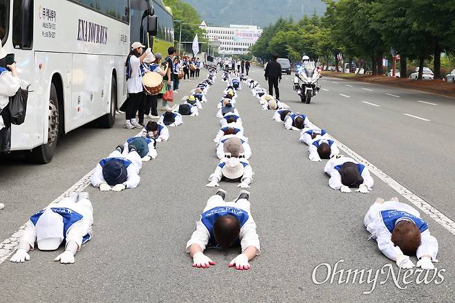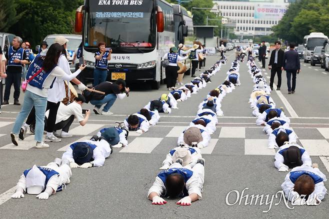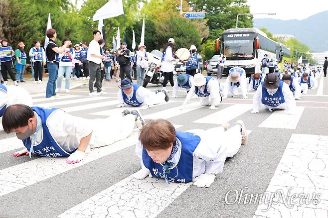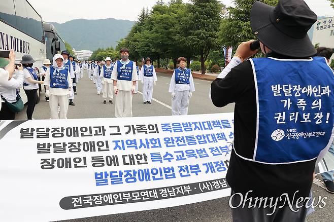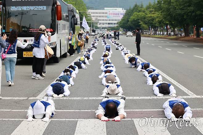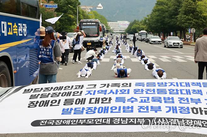 | ▲ 전국장애인부모연대 경남지부는 5월 30일 오전 경남도청 정문 앞 도로에서 “발달장애인 가정 생명보호 정책지원체계 구축 촉구” 결의대회를 연 뒤 오체투지를 했다. |