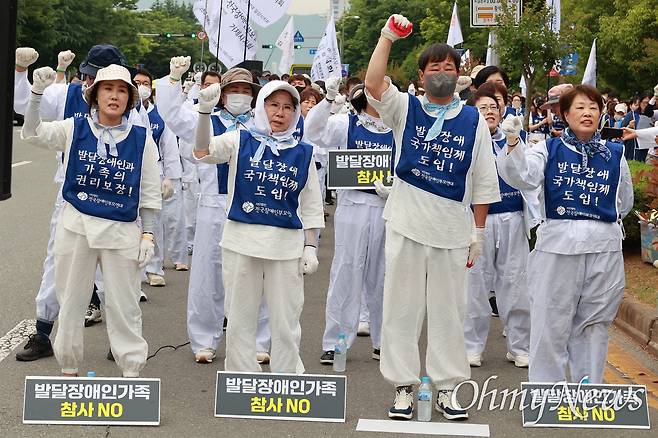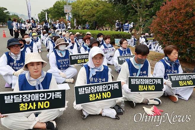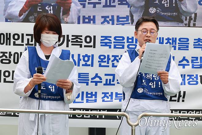 윤 회장은 "우리는 2018년 삭발과 삼보일배, 천막농성에 이어 2022년 557명의 발달장애인과 그 가족의 삭발과 단식투쟁 등 끊임없는 투쟁 활동으로 사회의 변화를 요구했다"라면서 "2023년 수천 명의 부모연대 회원이 제주부터 서울까지 뜨거운 아스팔트 바닥에 몸을 던지며 '더 이상 죽이지 않고, 죽지 않을 수 있는 사회'를 염원하며 투쟁했지만 정부는, 국회는 여전히 응답하지 않았다"라고 지적했다.