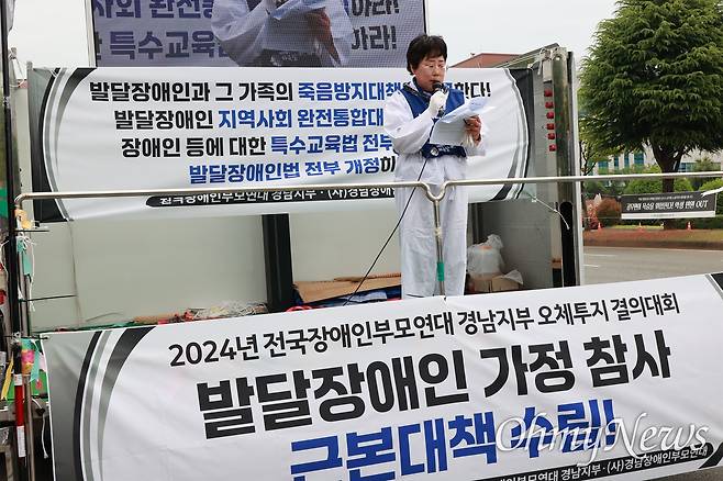 결의대회는 참가자들이 '님을 위한 행진곡'을 부른 뒤 고인에 대한 묵념으로 시작됐다. 박명화 김해지회장은 '발달장애인 가족 참사 현황 보고'를 하면서 숱한 사례를 언급했다.