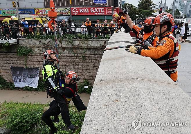 (서울=연합뉴스) 한상균 기자 = 30일 서울 청계천 오간수교에서 재난 상황 시민 구조 훈련을 하고 있다. 서울시는 이날 청계천에서 풍수해 대비 훈련을 진행했다. 2024.5.30