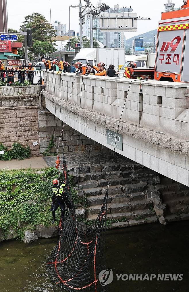 (서울=연합뉴스) 한상균 기자 = 30일 서울 청계천 오간수교에서 재난 상황 시민 구조 훈련을 하고 있다. 서울시는 이날 청계천에서 풍수해 대비 훈련을 진행했다. 2024.5.30