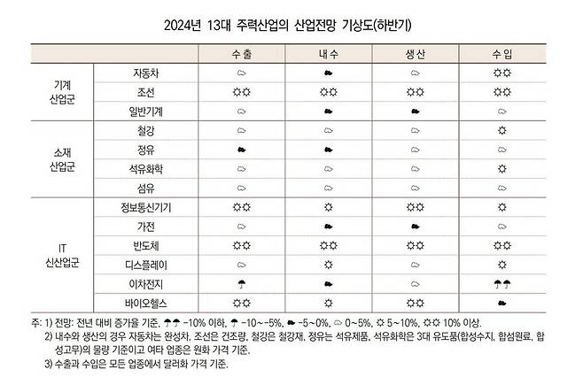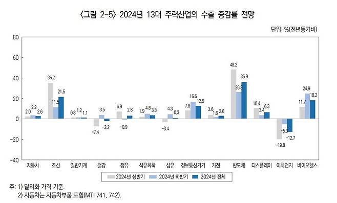 산업연구원은 "수출단가 회복에 힘 입어 점진적으로 회복 국면에 진입할 것으로 기대한다"고 설명했습니다. 하반기 성장으로, 연간 수출은 2023년 대비 3.3% 늘 것으로 전망했습니다.