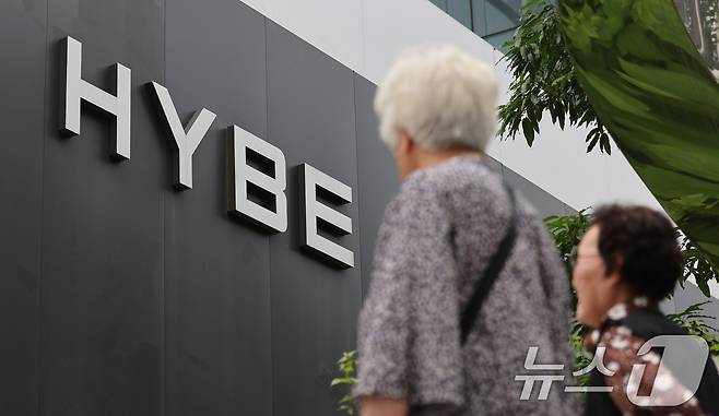 (서울=뉴스1) 박지혜 기자 = 30일 오후 서울 용산구 하이브본사 앞으로 시민들이 지나가고 있다.