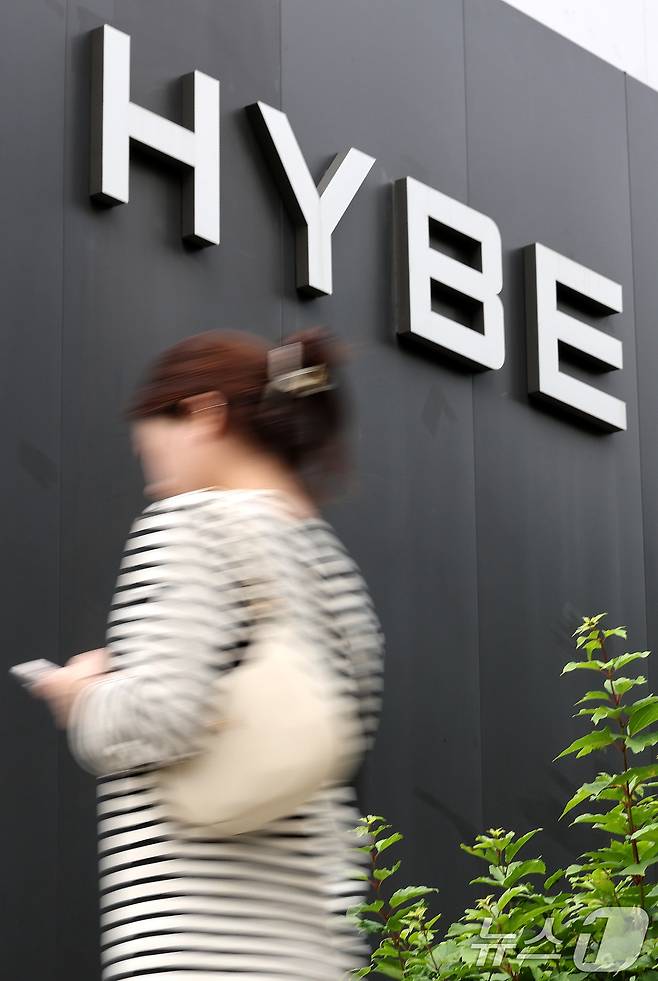 (서울=뉴스1) 박지혜 기자 = 30일 오후 서울 용산구 하이브본사 앞으로 시민들이 지나가고 있다.