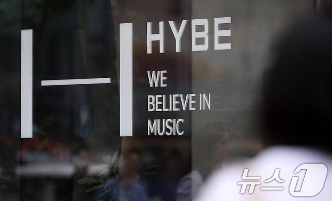 (서울=뉴스1) 박지혜 기자 = 30일 오후 서울 용산구 하이브본사 앞으로 시민들이 지나가고 있다.