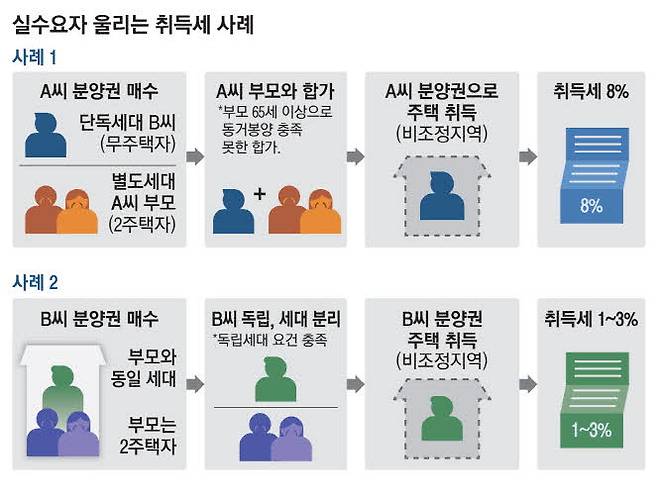 분양권을 계약한 이후 세대를 합가하거나 분리하면 더 복잡하다. 예를 들어, 2021년 11월 분양권을 계약한 이 모씨는 경제 사정이 어려워 2022년 12월 부모님과 합가했다. 올해 이씨는 3년 전 매입한 분양권 아파트가 준공돼 취득세를 내려는데 3주택자 취득세가 중과(8%, 비조정지역)된다고 들었다. 3년 전 분양권 매입 때 그는 단독세대 무주택자였다. 하지만 현재 같은 세대를 이루고 있는 부모가 이씨의 분양권 계약 당시 2주택이어서 3주택 취득세율이 적용된다는 것이다. 주택 수는 주택 취득일 현재 동일 세대 기준이고, 그 세대의 주택 수는 분양권 취득일 당시 소유한 주택 수를 기준으로 삼기 때문이다.
