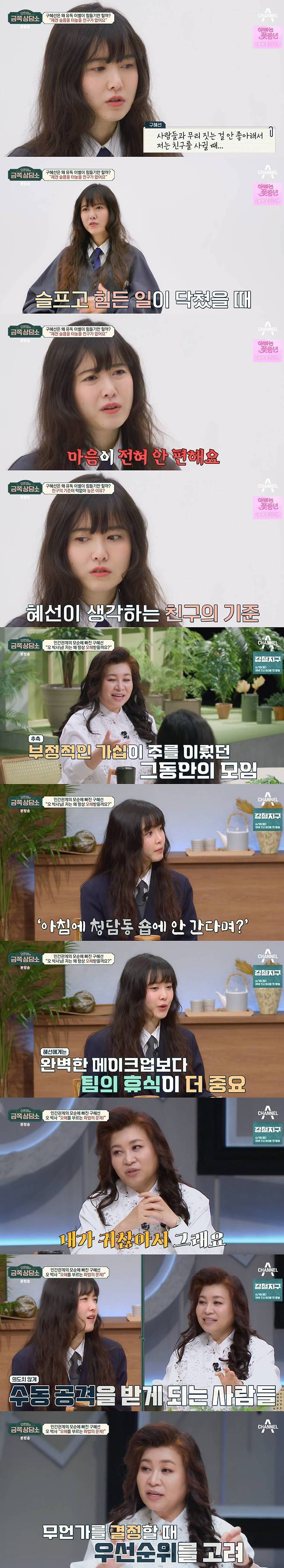 (엑스포츠뉴스 이예진 기자) 배우 구혜선이 슬픔을 나눌 친구가 없다고 밝히며 오해받는 상황에 대해 억울함을 표했다. 이에 오은영은 화법의 문제를 꼬집으며 조언을 더했다.