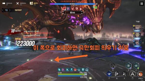 극한 회피를 가장 터트리기 쉬운 패턴 중 하나다. 브레스에 닿을 듯한 위치에서 회피하면 쉽다. 이후 성진우 QTE 스킬 그림자 밟기로 빠르게 딜각을 잡되, 중간에서 투명 턱에 걸리지 않도록 널널하게 이동한다.